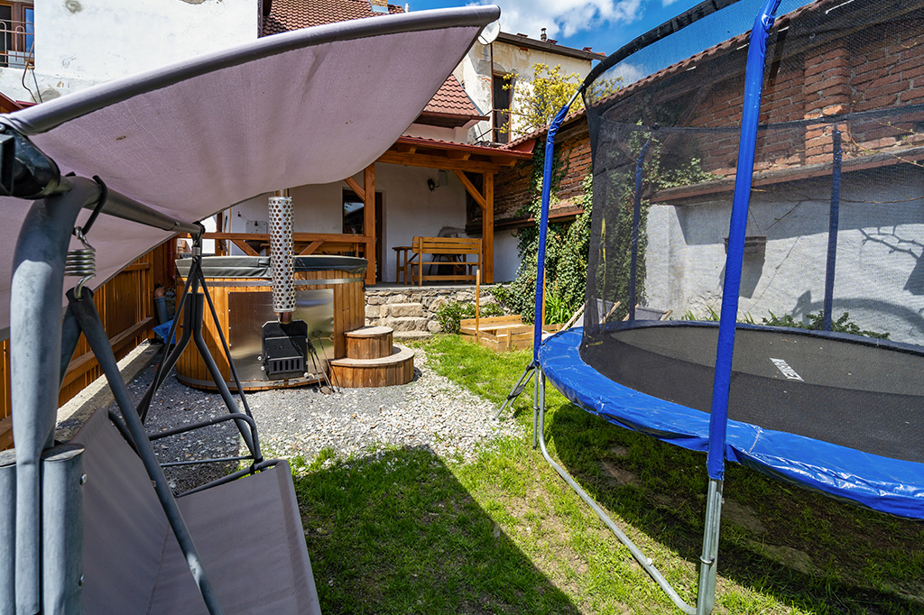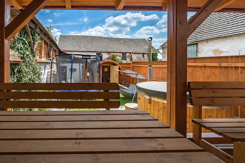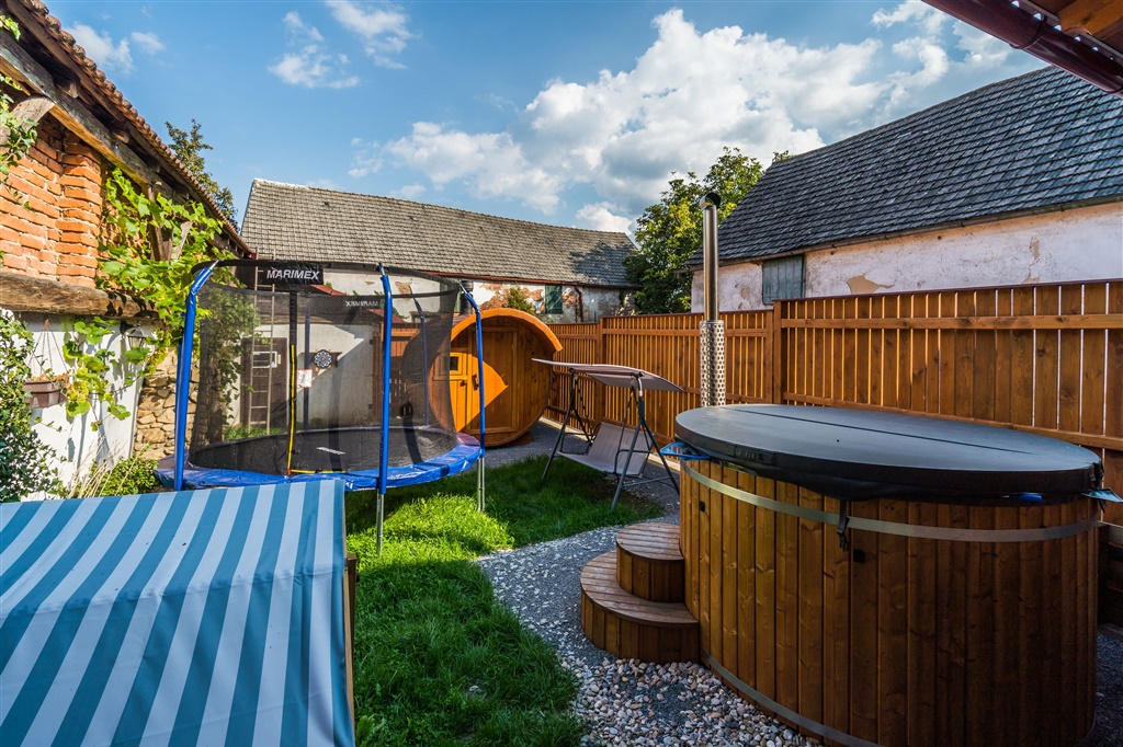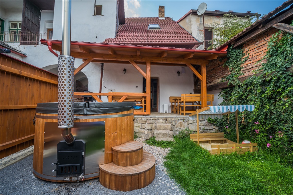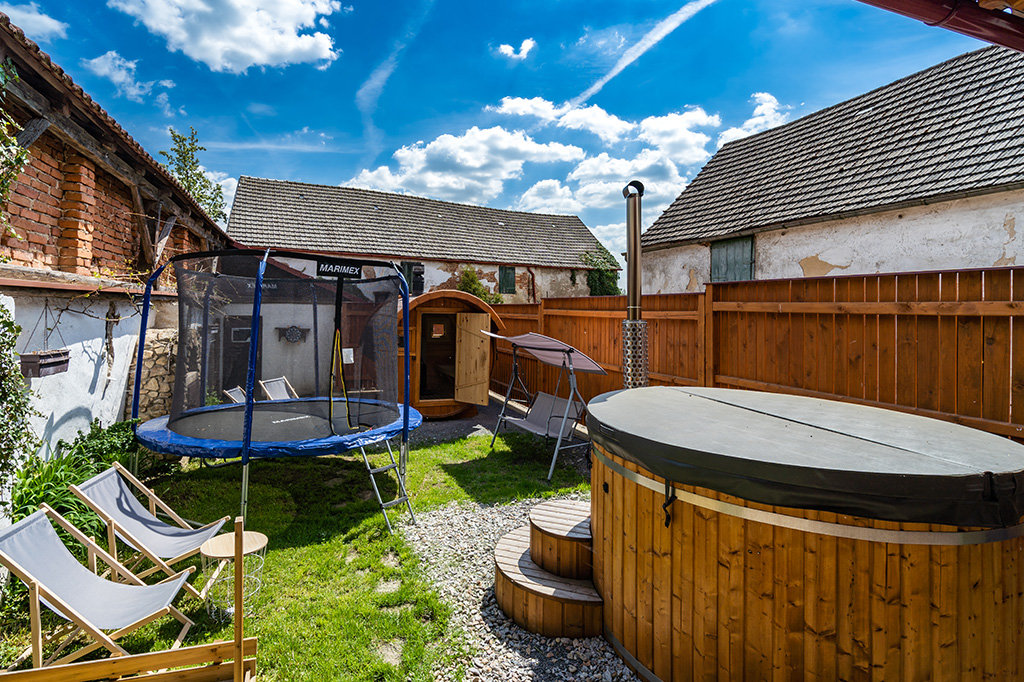 venkovní koupací káď a srubová sauna neomezeně během pobytu