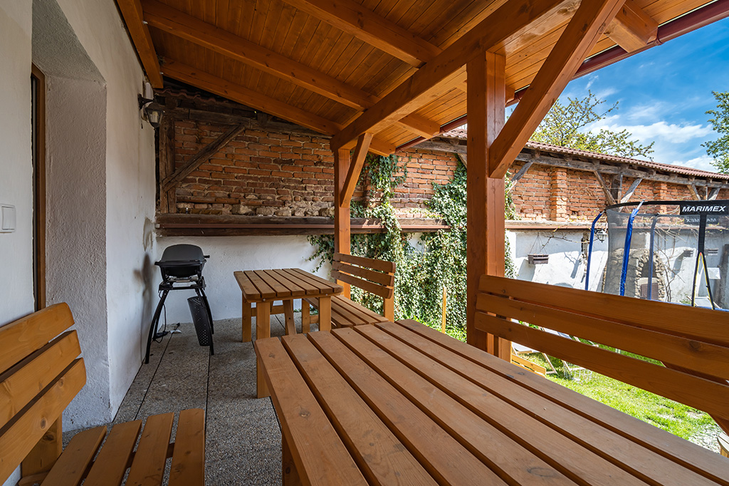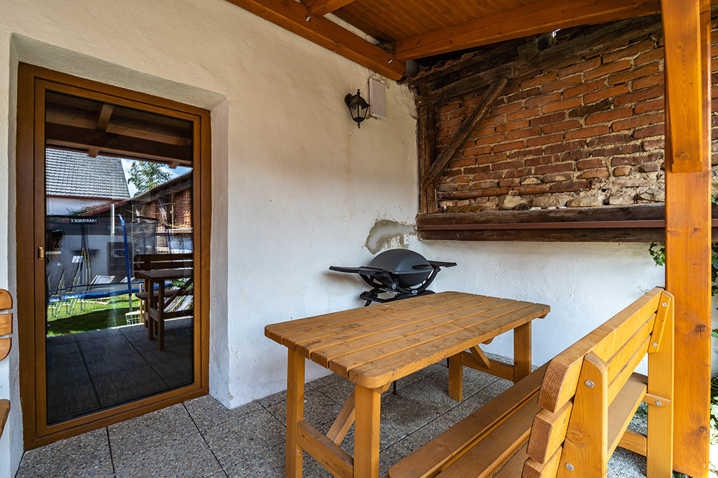 Oplocený pozemek, osvětlená terasa a zastřešená pergola s posezením, grilem, pískoviště, herna. Domácí zvíře po dohodě. Možnost úschovy kol.