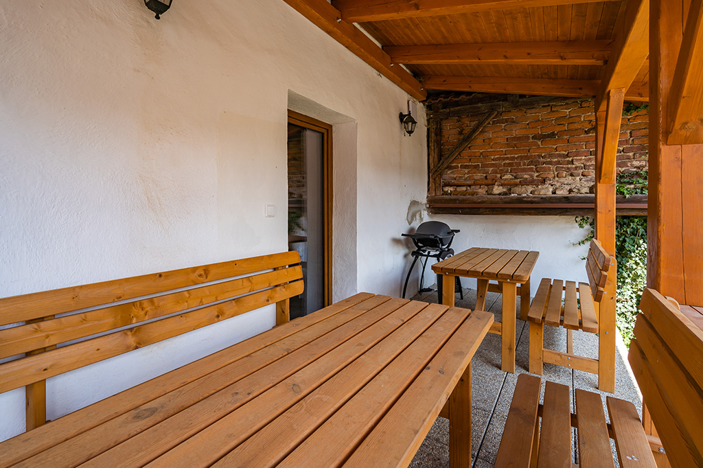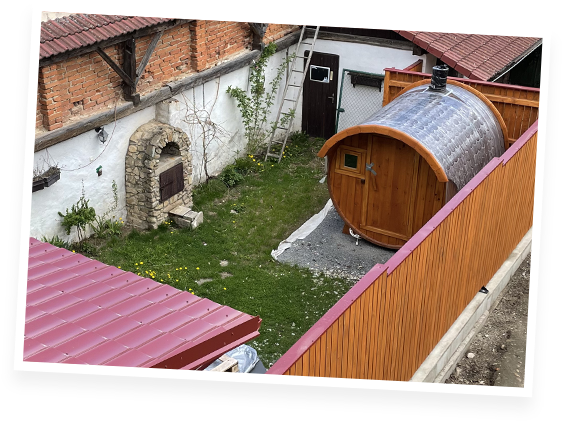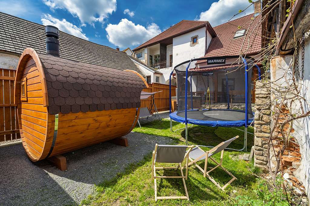 Venkovní Wellness v podobě koupací kádě a srubové sauny s neomezeným přístupem během celého pobytu.