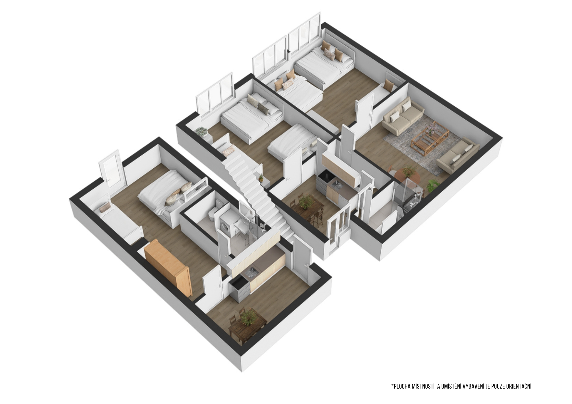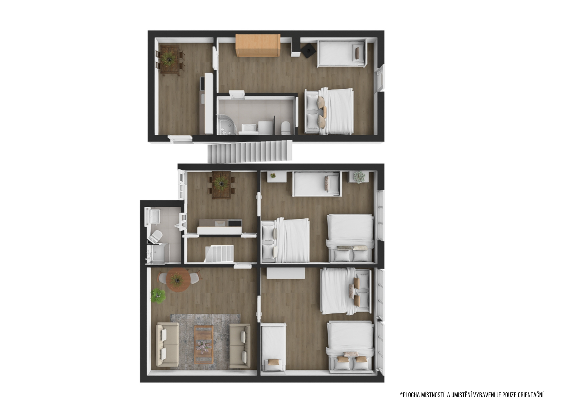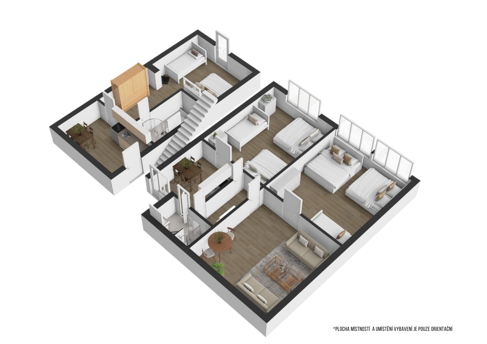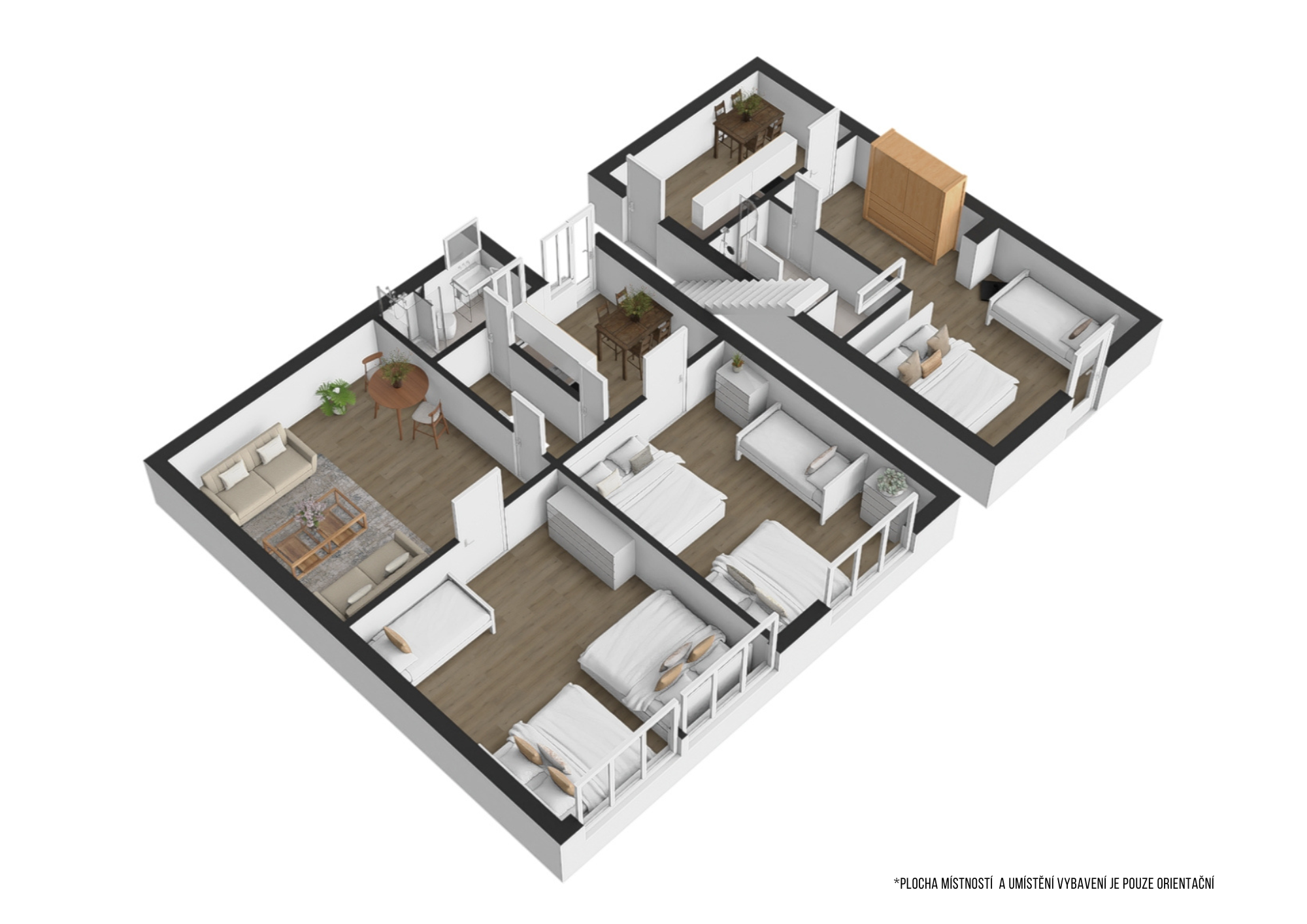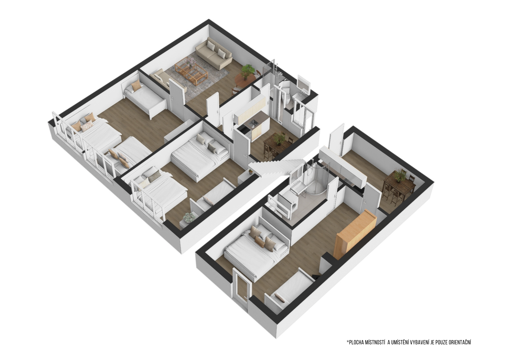 2x koupelna se sprchovým koutem a WC, dětské postýlky k dispozici.