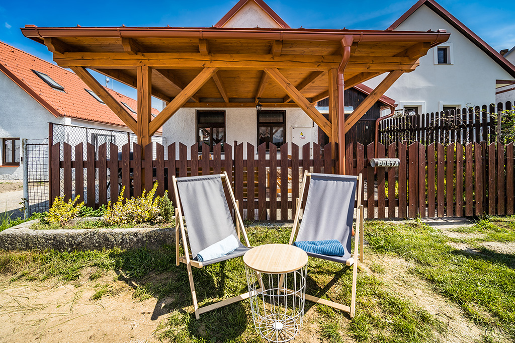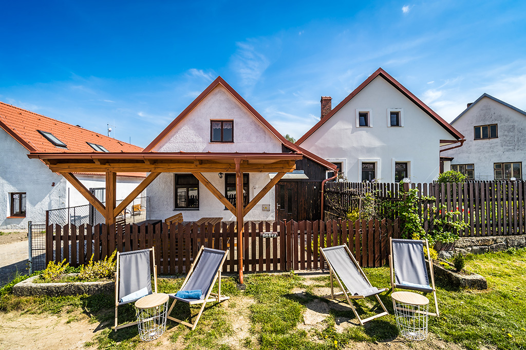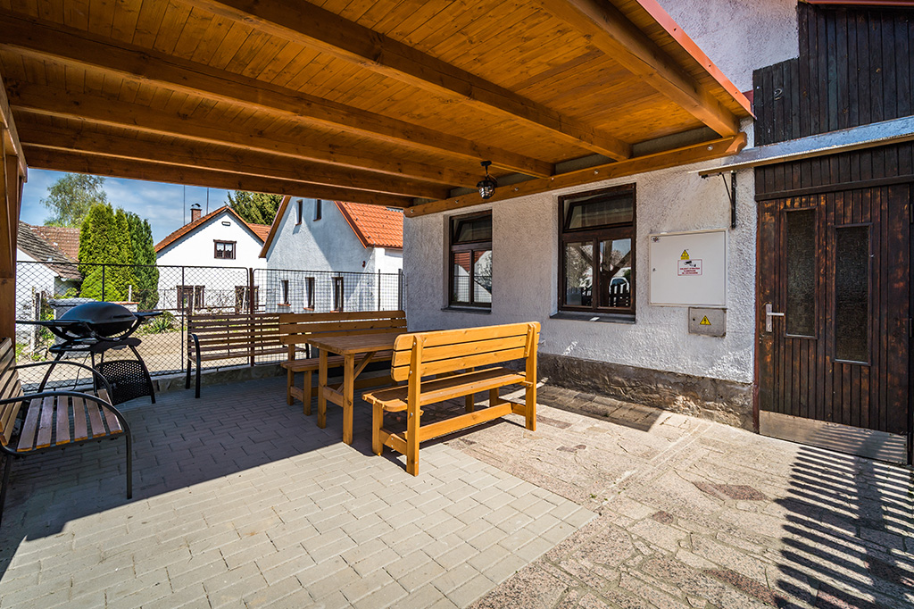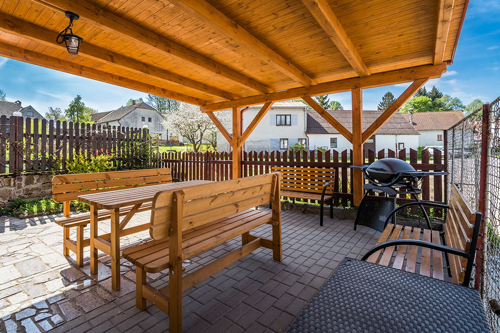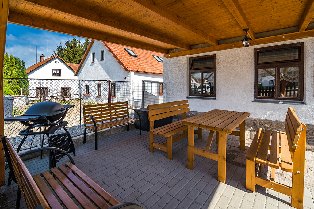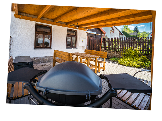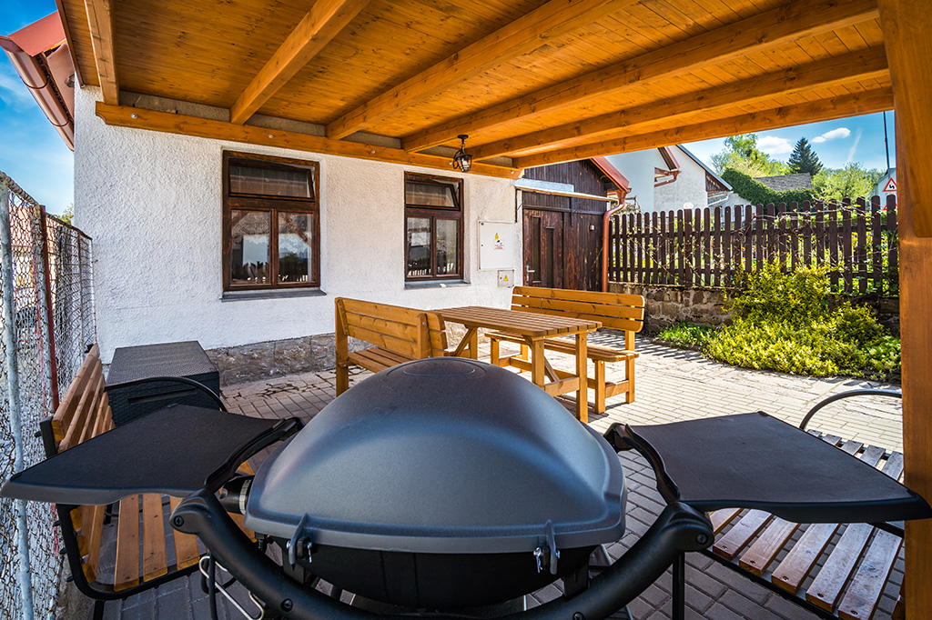 Malá rodinná chalupa s předzahrádkou a posezením v zastřešené pergole s grilem, plně vybavenou kuchyní, koupelnou a odděleným wc.