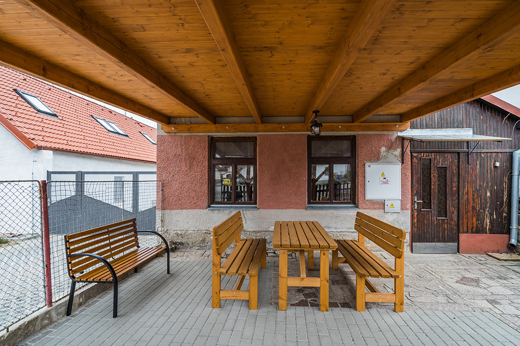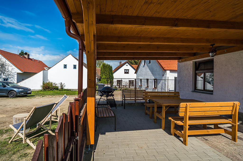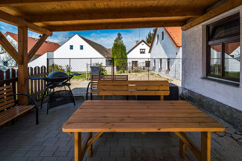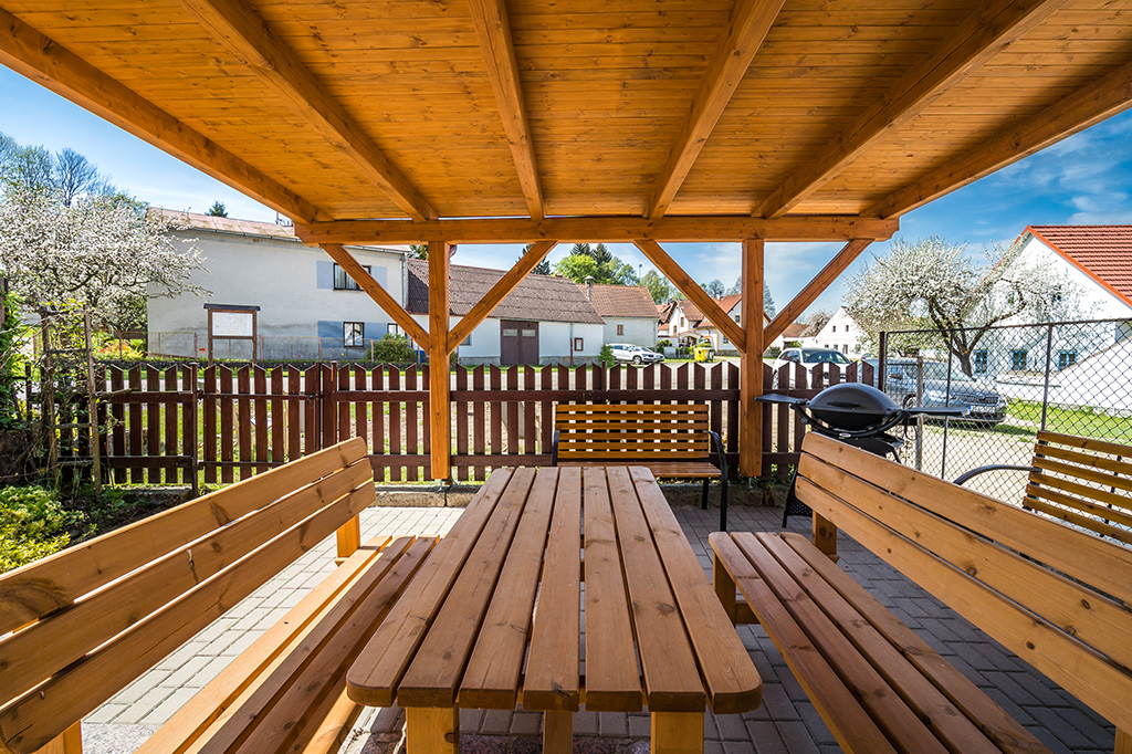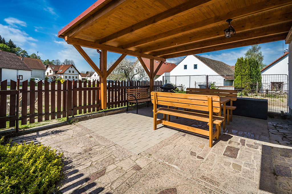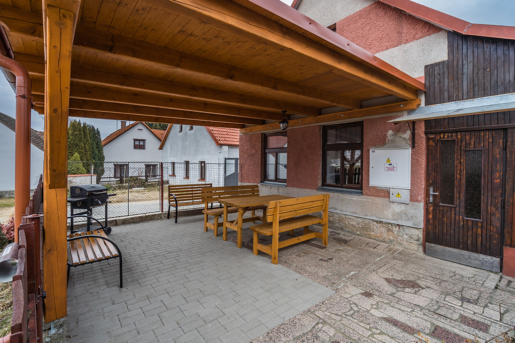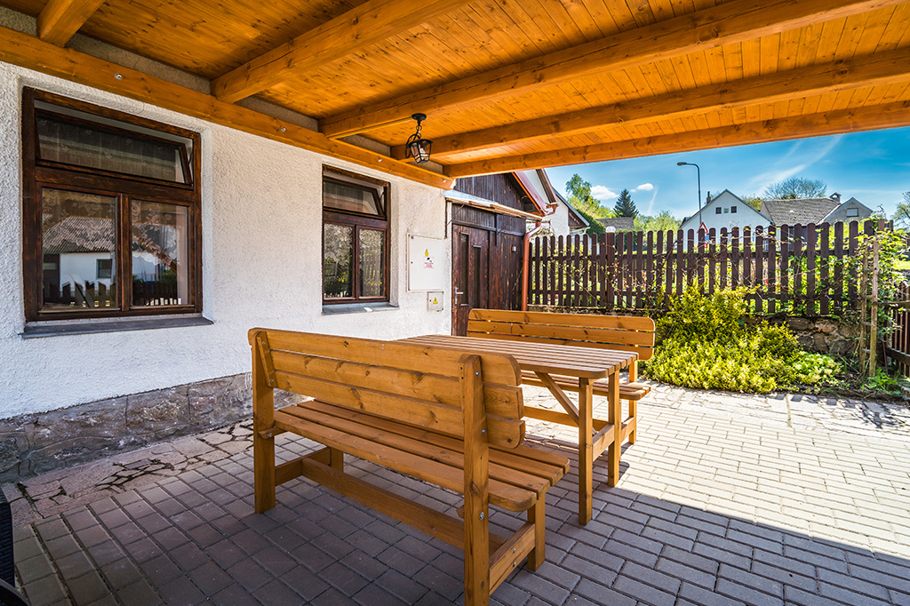 Malá rodinná chalupa s předzahrádkou a posezením v zastřešené pergole s grilem, plně vybavenou kuchyní, koupelnou a odděleným wc.